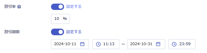 商品管理 / 商品一覧 / 商品登録 にて「商品割引」「割引期間」を設定すると、期間を限定して商品価格を割引することができます。