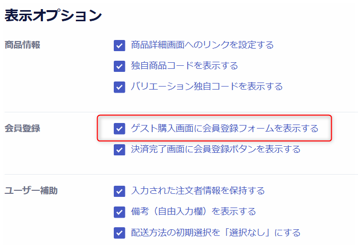 「ゲスト購入画面に会員登録フォームを表示する」へチェックを入れる