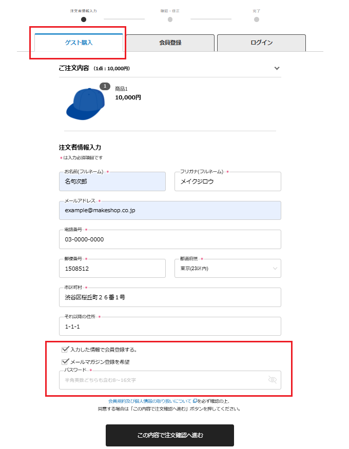 下記を設定することにより、ゲスト(非会員)が購入と同時に会員登録できるようになります。